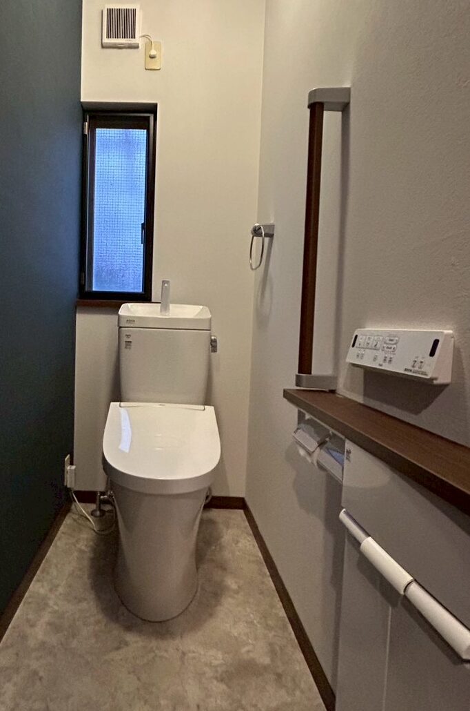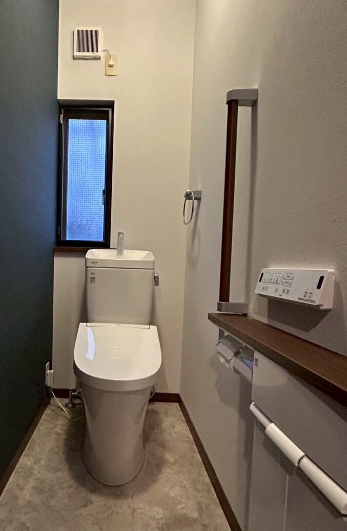 • 工事内容:既存トイレ撤去処分・トイレ取付工事(全内装含む)+換気扇・壁収納棚・手すり取付(オプション工事)
